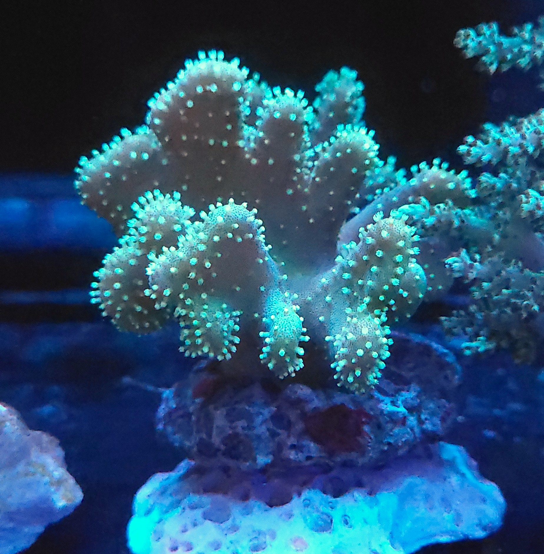 Lobophyton sp., należący do grupy koralowców miękkich (Soft Corals), znany jest potocznie jako koral palczasty lub koral skórzasty (podobnie jak Sarcophyton), lecz wyróżnia się bardziej rozgałęzioną, palczastą strukturą i chropowatą powierzchnią z widocznymi polipami. Jest popularnym wyborem w akwariach rafowych dzięki swojej odporności i atrakcyjnemu wyglądowi.