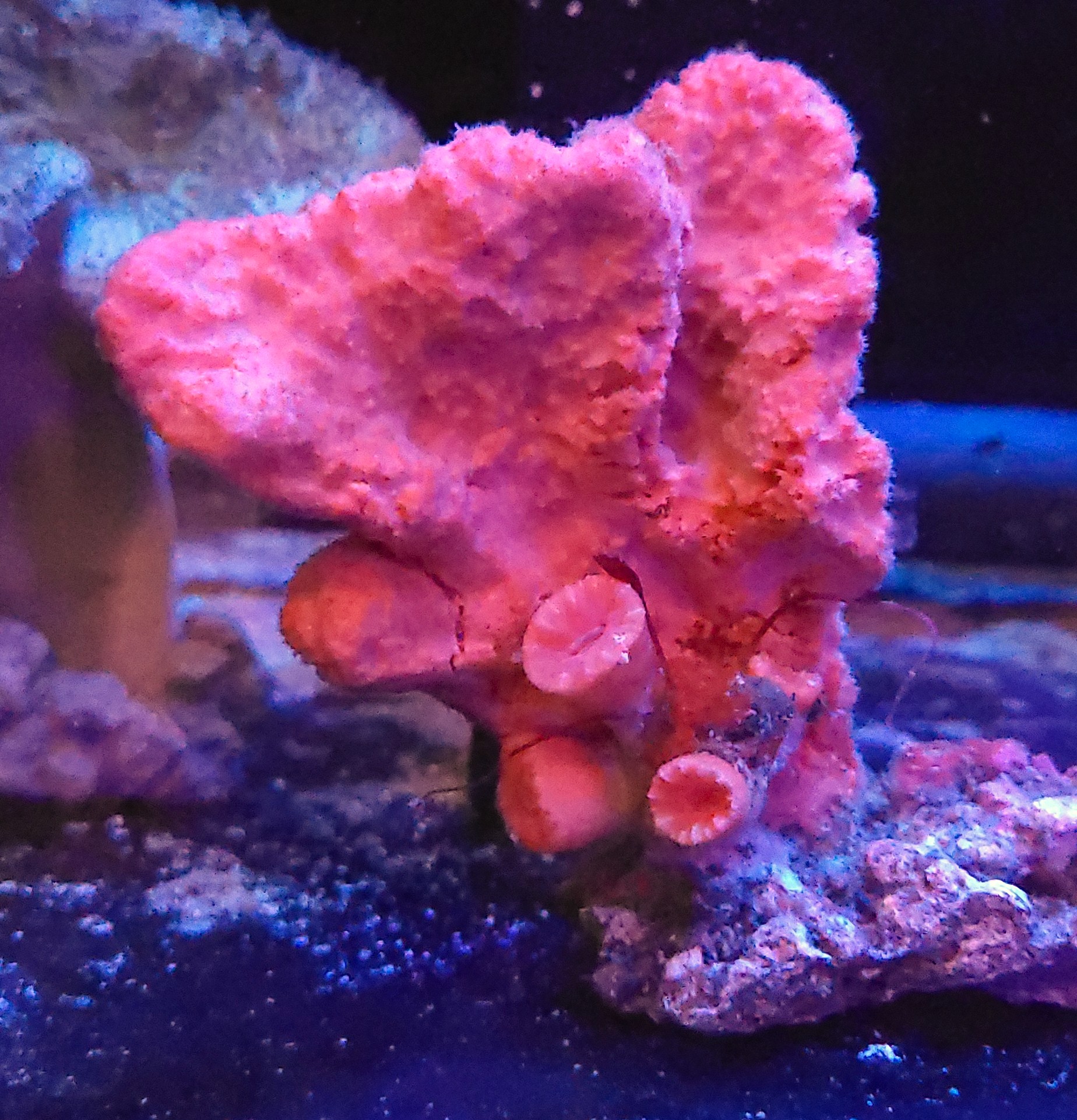 Orange Spiny Sponge wyróżnia się intensywnie pomarańczowym ubarwieniem oraz charakterystyczną, nieregularną strukturą pokrytą drobnymi kolczastymi wypustkami. Może przyjmować różne formy — od rozgałęzionych, przez bryłowate, aż po nieregularne narośla, które nadają jej bardzo naturalny, „żywy” wygląd w akwarium.