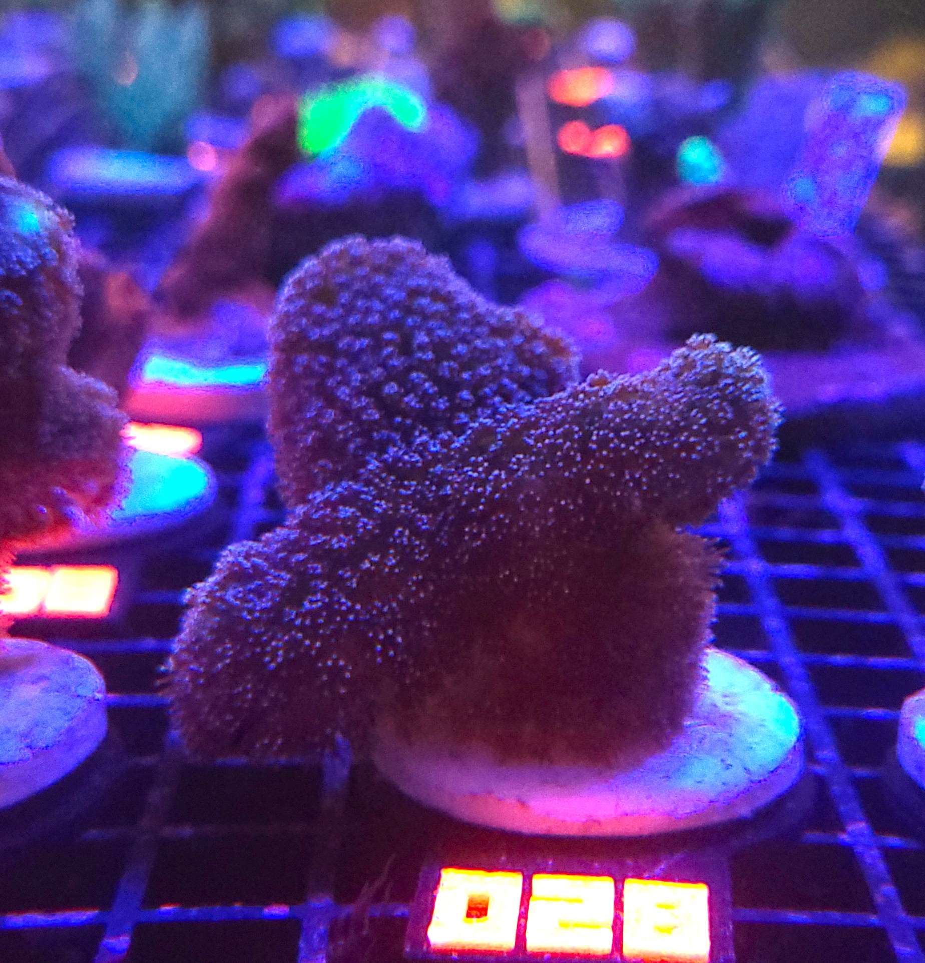 Stylophora pistillata „Milka” to jedna z najbardziej rozpoznawalnych i lubianych odmian korali SPS, ceniona za intensywnie fioletowe, wręcz „mleczno-lawendowe” wybarwienie oraz zwartą, krzaczastą strukturę. Jej grube, krótkie gałązki tworzą gęste, kompaktowe kolonie, które nadają akwarium wyrazisty, elegancki charakter. Pod odpowiednim oświetleniem kolor może przybierać odcienie od jasnego lila po głęboki fiolet, często z delikatnym połyskiem.